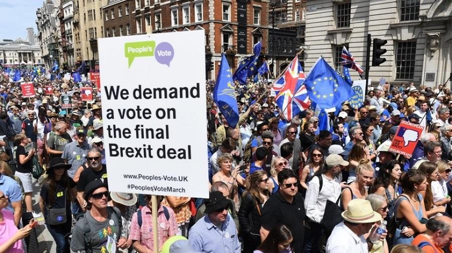 Χιλιάδες υποστηρικτές της Ευρωπαϊκής Ένωσης συγκεντρώθηκαν σήμερα στο κέντρο του Λονδίνου για να ζητήσουν από τη βρετανική κυβέρνηση να πραγματοποιήσει μια τελική ψηφοφορία για τους όρους του Brexit.