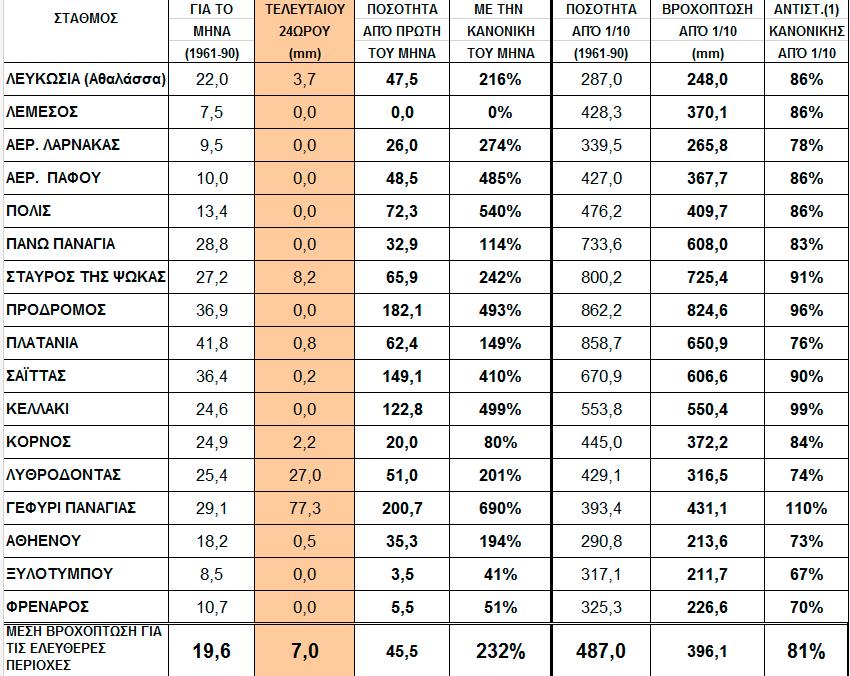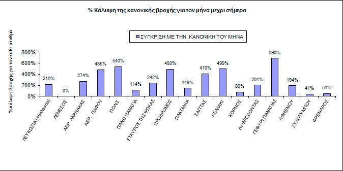 Στο 81% της κανονικής από την 1η Οκτωβρίου του 2017 έφτασε η βροχόπτωση με τις βροχές του τελευταίου 24ωρου να φτάνουν τα 7 χιλιοστά και τη βροχόπτωση για τον Μάιο να φτάνει στο 232% της κανονικής για το μήνα, Σύμφωνα με τη Μετεωρολογική Υπηρεσία στη Λευκωσία η βροχόπτωση έφτασε στο 216% σε σύγκριση με την κανονική του μήνα, στη Λεμεσό στο 0%, στο αεροδρόμιο Λάρνακας στο 274%, στο αεροδρόμιο Πάφου στο 485%, στην Πόλη Χρυσοχούς στο 540%, στη Πάνω Παναγιά στο 114%, στο Σταυρό της Ψώκας στο 242%, στον Πρόδρομο στο 493%, στα Πλατάνια στο 149%, στον Σαϊττα στο 410%, στο Κελλάκι στο 499%, στον Κόρνο στο 80%, στον Λυθροδόντα στο 201%, στο Γεφύρι της Παναγιάς στο 690%, στην Αθηένου στο 194%, Ξυλοτύμπου 41%, Φρέναρος 51%,