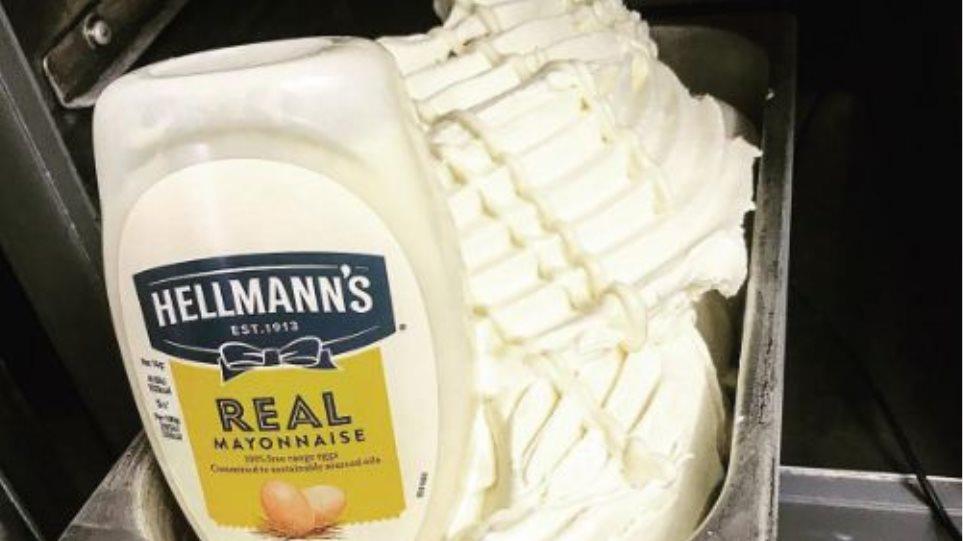 Εξήγησε ότι το παγωτό παρασκευάζεται απλά αναμειγνύοντας τη μαγιονέζα Hellman's με το σπιτικό γαλακτοκομικό μίγμα παγωτού του, το οποίο παστεριώνεται στο κατάστημα.