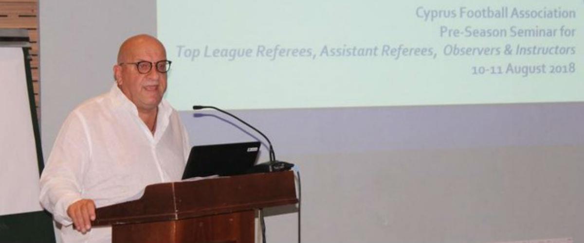 Ανοίγοντας τις εργασίες του Σεμιναρίου Διαιτησίας, μαζί με τους συνεργάτες μου στην ηγεσία της ΚΟΠ που βρίσκονται σήμερα μαζί μας, δεν μπορώ να κρύψω την ικανοποίησή μας για το επίπεδο της διαιτησίας κατά την περσινή χρονιά. Αναφέρομαι σε γεγονότα και όχι θεωρίες, που μόνο οι κακόπιστοι και οι κακοπροαίρετοι δεν είδαν. Ιδιαίτερα, θέλω να αναφερθώ στα τελευταία κρίσιμα παιχνίδια όπου κρίθηκε ο τίτλος του πρωταθλητή, αλλά και στον τελικό Κυπέλλου. Εκεί η κυπριακή διαιτησία έδωσε εξαιρετικά δείγματα γραφής, αντανακλώντας την ευρύτερη θετική εικόνα σας καθ΄ όλη την διάρκεια της χρονιάς.