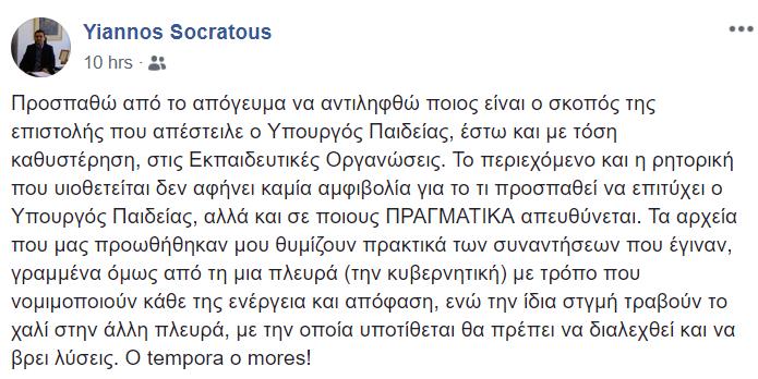 Αρνητικός εμφανίστηκε από την πλευράς του και ο πρόεδρος της ΟΕΛΜΕΚ, Γιάννος Σωκράτους, που σε ανάρτηση του στο facebook, ανέφερε πως, «το περιεχόμενο και η ρητορική που υιοθετείται δεν αφήνει καμία αμφιβολία για το τι προσπαθεί να επιτύχει ο Υπουργός Παιδείας, αλλά και σε ποιους πραγματικά απευθύνεται».