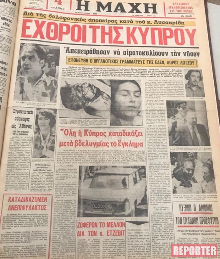 Δια μιας απαίσιας ενέδρας οι άνανδροι εγκληματίαι αποπειράθηκαν να δολοφονήσουν τον Αρχηγό της ΕΔΕΚ βουλευτή Βάσο Λυσσαρίδη ο οποίος ως εκ θαύματος διέφυγε τα δολοφονικά πυρά τραυματισθείς ελαφρώς εις το πίσω μέρος της κεφαλής.