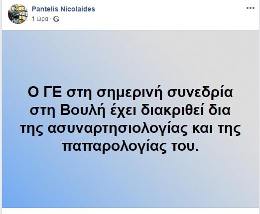 Υπενθυμίζεται πως η ανάρτηση του κ. Νικολαΐδη, η οποία περιήλθε στην αντίληψη του Οδυσσέα Μιχαηλίδη και την οποία ο Γενικός Ελεγκτής ανέγνωσε ενώπιον της Επιτροπής, προκάλεσε την αποβολή του από την αίθουσα από τον Δημήτρη Συλλούρη.