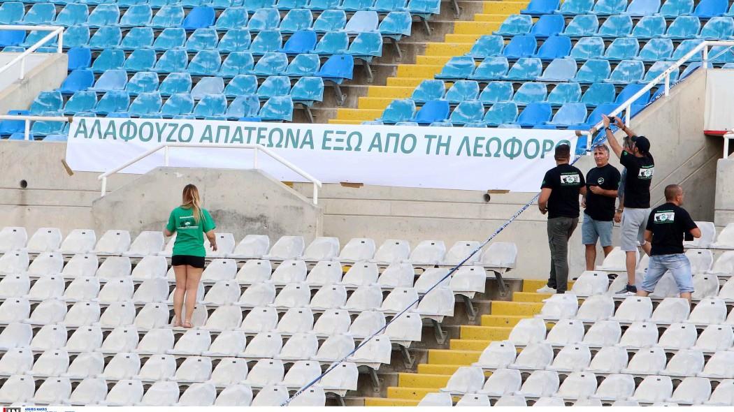 Συνθήματα κατά του Γιάννη Αλαφούζου από τον κόσμο του Παναθηναϊκού πριν το ματς με την Ομόνοια στο ΓΣΠ.
