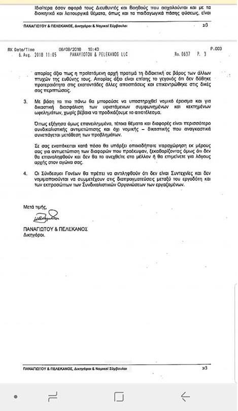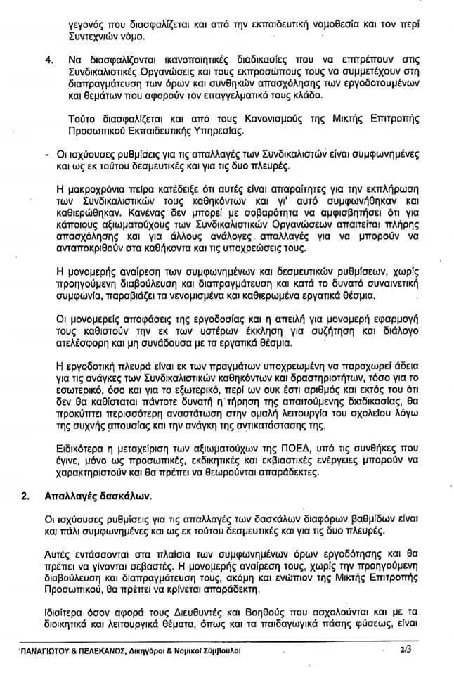 Τέλος στο τελευταίο μέρος της γνωμάτευσης σημειώνεται πως, «οι Σύνδεσμοι Γονέων θα πρέπει να αντιληφθούν ότι δεν είναι Συντεχνίες και δεν νομιμοποιούνται να συμμετέχουν στις διαπραγματεύσεις μεταξύ του εργοδότη και των εκπροσώπων των Συνδικαλιστικών Οργανώσεων των εργαζομένων».