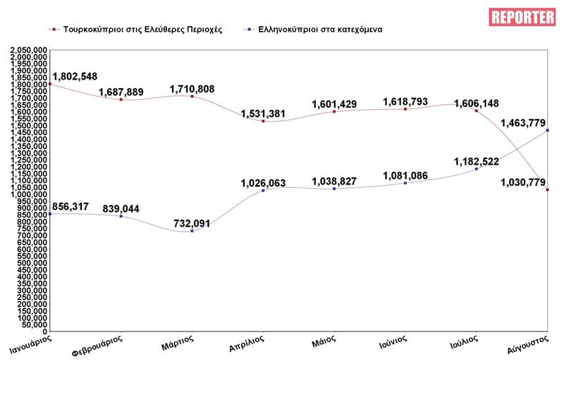 Συγκεκριμένα από τότε που υπάρχουν καταγεγραμμένα στοιχεία, οι Τουρκοκύπριοι ξόδευαν πάντα περισσότερα στις Ελεύθερες περιοχές, πράγμα που άλλαξε για πρώτη φορά τον Αύγουστο με τους Ελληνοκύπριους να πληρώνουν στα κατεχόμενα ένα εκατομμύριο 463 χιλιάδες ευρώ, ποσό κατά 400 χιλιάδες περίπου μεγαλύτερο από αυτό που πλήρωσαν οι Τουρκοκύπριοι στις Ελεύθερες Περιοχές.