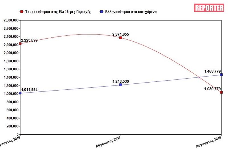 Η διαφορά ωστόσο έγκειται στο γεγονός πως για τις ίδιες περιόδους τα δύο προηγούμενα χρόνια οι Τουρκοκύπριοι ξόδευαν σχεδόν τα διπλάσια στις Ελεύθερες περιοχές, ωστόσο τον Αύγουστο του 2018 και υπό τις παρούσες συνθήκες οι Ελληνοκύπριοι όχι μόνο κάλυψαν τη διαφορά του ενός εκατομμυρίου αλλά αύξησαν τη διαφορά κατά 400 χιλιάδες ευρώ.