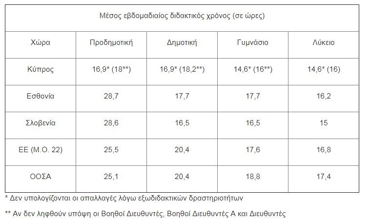 Από το γράφημα στη σελίδα 25, και τον πίνακα στην ίδια σελίδα, που αφορούν τον γυμνασιακό κύκλο, φαίνεται ότι η Κύπρος έχει μικρότερο χρόνο διδασκαλίας (18 ώρες, δηλαδή 24 περιόδους των 45 λεπτών) σε σχέση με τις περισσότερες χώρες. Σημειώνεται ότι ο αριθμός των 18 ωρών που δηλώνεται για την Κύπρο δεν περιλαμβάνει ούτε τις μειώσεις στο διδακτικό χρόνο για τον λεγόμενο «βιολογικό παράγοντα», ούτε και τις άλλες απαλλαγές για άλλα εξωδιδακτικά καθήκοντα.