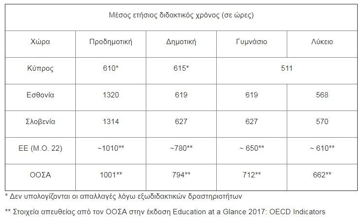 Επίσης, στην Έκθεση του Διεθνούς Οίκου Εμπειρογνωμόνων, καταγράφονται και τα εξής στοιχεία που αφορούν τον συνολικό διδακτικό χρόνο των εκπαιδευτικών. Σημειώνεται ότι στην μελέτη είχαν χρησιμοποιηθεί ως μέτρο σύγκρισης, εκτός από τον ευρωπαϊκό και παγκόσμιο μέσο όρο (μελέτες ΟΟΣΑ), τα στοιχεία της Εσθονίας και Σλοβενίας που είναι χώρες με υψηλές ακαδημαϊκές επιδόσεις: