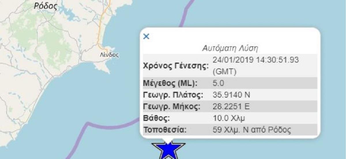 Σεισμική δόνηση μεγέθους πέντε βαθμών της κλίμακας Ρίχτερ, σημειώθηκε στις 16:30 το απόγευμα ανοιχτά της Ρόδου.