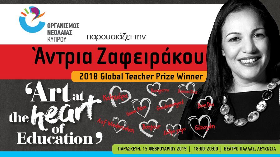 Ο Οργανισμός Νεολαίας Κύπρου παρουσιάζει, την Παρασκευή 15 Φεβρουαρίου 2019 στο Κινηματοθέατρο Παλλάς στη Λευκωσία, την Άντρια Ζαφειράκου, την Καλύτερη Δασκάλα του Κόσμου σύμφωνα με την Επιτροπή του ιδρύματος Varkey Foundation. H κα Ζαφειράκου ξεχώρισε ανάμεσα σε 30.000 εκπαιδευτικούς και τιμήθηκε με το Παγκόσμιο Βραβείο Δασκάλου 2018 (2018 Global Teacher Prize).