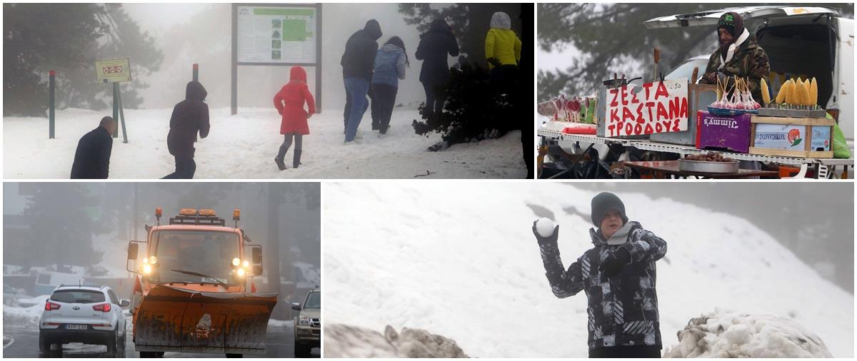 Σημειώνεται πως στην πλατεία Τροόδους, το ύψος των χιονιών είναι 15 εκατοστόμετρα και στην κορυφή του Ολύμπου 25 εκατοστόμετρα.