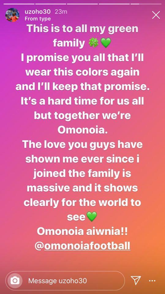 «Αυτό είναι για όλη την πράσινη οικογένειά μου. Σας υπόσχομαι ότι θα ξαναφορέσω αυτά τα χρώματα και θα κρατήσω αυτή την υπόσχεση. Είναι μια δύσκολη στιγμή για όλους μας, αλλά μαζί είμαστε η Ομόνοια. Η αγάπη που μου δείξατε από τότε που ήρθα στην ομάδα, είναι τεράστια και αυτό είναι κάτι που μπορεί να το δει ο κόσμος. Ομόνοια Αιώνια!».
