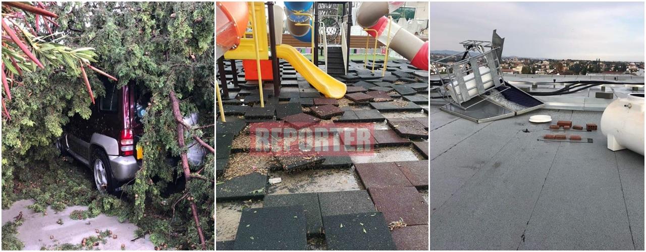 Δύο αυτοκίνητα καταπλακώθηκαν από δέντρα, ντεπόζιτα σπιτιών μετακινήθηκαν από τη θέση τους, ενώ πλημμύρισαν σπίτια και άλλα υποστατικά.