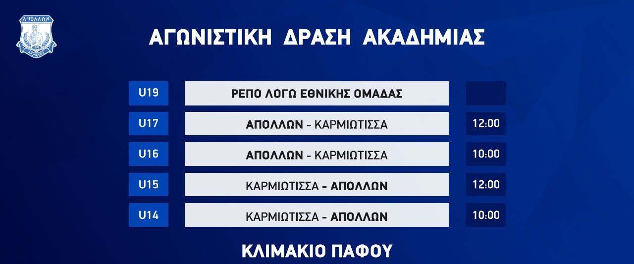 Οι ομάδες Παίδων Κ14 και Κ15 θα αγωνιστούν εκτός έδρας στο Κοινοτικό γήπεδο Πάνω Πολεμιδιών ενώ οι ομάδες Κ16 και Κ17 θα φιλοξενήσουν τις αντίστοιχες ομάδες της Καρμιώτισσας στο βοηθητικό γήπεδο του Τσιρείου.