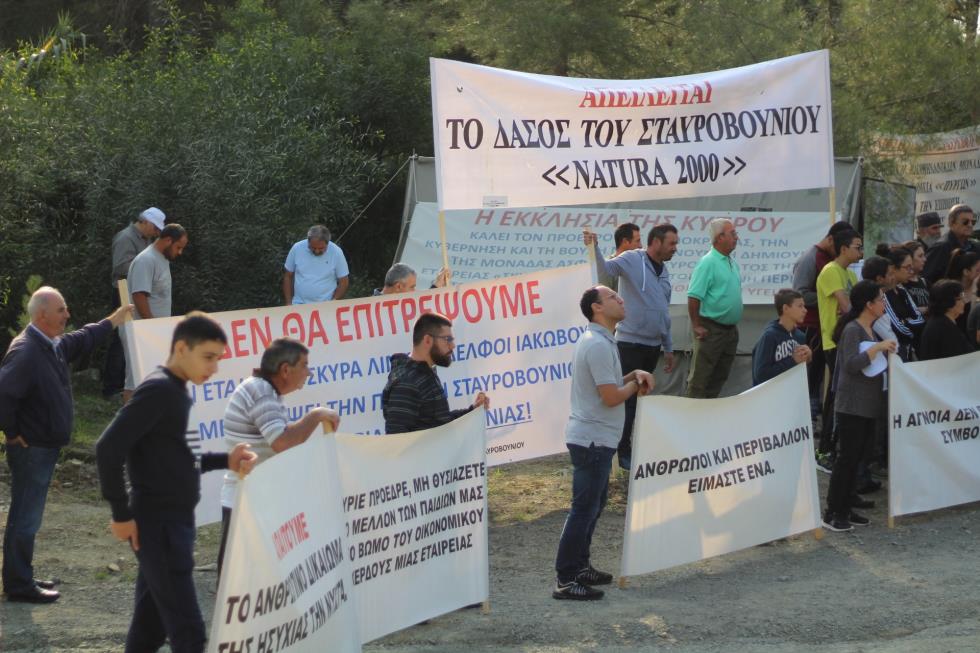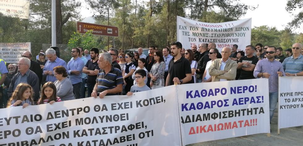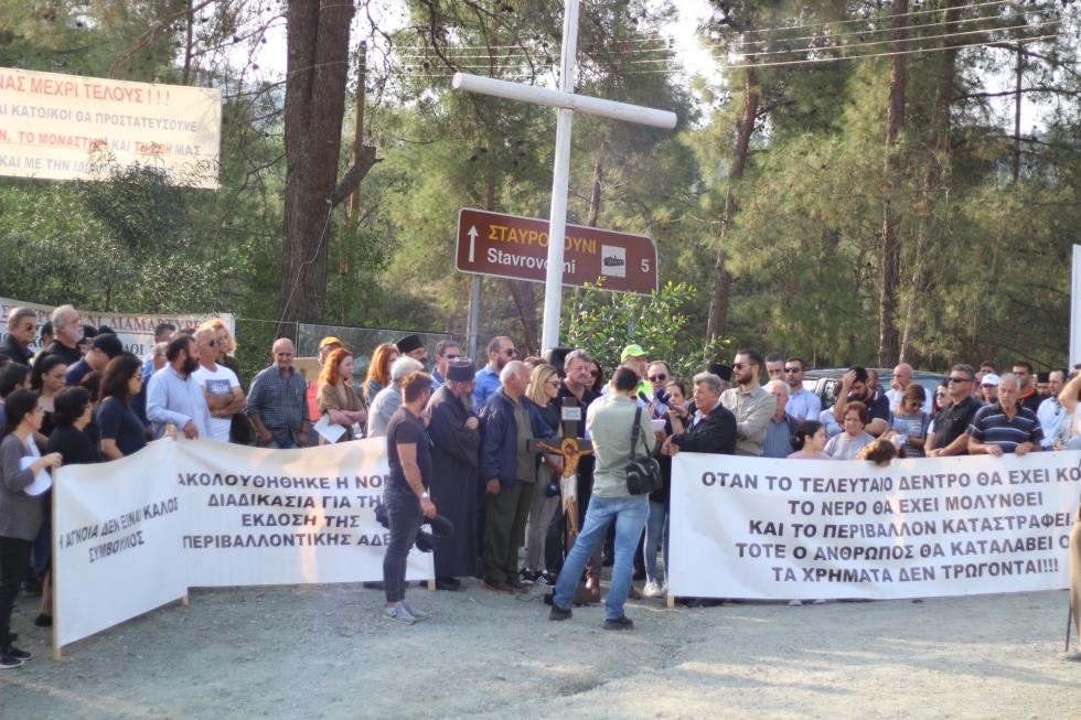 Με συνθήματα όπως «Καθαρό νερό, καθαρός αέρας, αδιαμφισβήτητα δικαιώματα», «Θέλουμε να αναπνέουμε καθαρό αέρα», «Κύριε Πρόεδρε, προστατεύστε το αρχαιότερο μοναστήρι της Κύπρου μας, το Σταυροβούνι», 200 και πλέον άτομα, μοναχοί και κάτοικοι της περιοχής Κόρνου – Πυργών πραγματοποίησαν το πρωί του Σαββάτου εκδήλωση διαμαρτυρίας, αντιδρώντας στην απόφαση του Υπουργικού Συμβουλίου να αλλάξει το συμβόλαιο εκμίσθωσης της κρατικής γης, ώστε να δικαιούται η εταιρεία Σκύρα Λίμα Λτδ, να δημιουργήσει εργοστάσιο παραγωγής και ανακύκλωσης ασφαλτικού σκυροδέματος στην περιοχή Σταυροβουνίου.