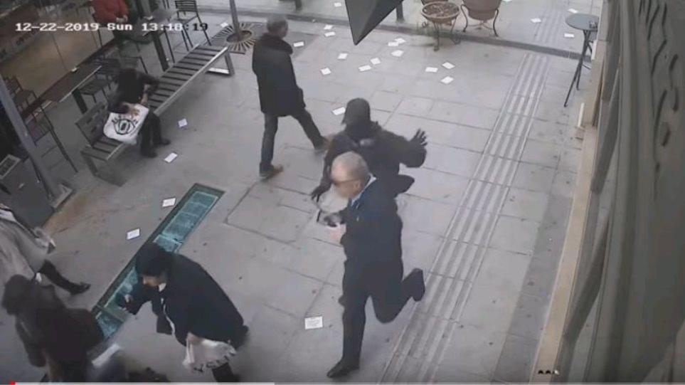 Σε βίντεο από κάμερα ασφαλείας διακρίνεται ένας αντιεξουσιαστής να τρέχει να χτυπήσει έναν τρομαγμένο ηλικιωμένο ο οποίος προσπαθεί να ξεφύγει.