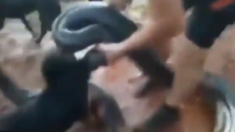 Tres ciclistas luchan contra una anaconda que intenta comerse a su perro