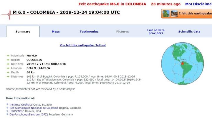 Ισχυρός σεισμός 6 βαθμών σημειώθηκε πριν λίγα λεπτά στην Κολομβία.