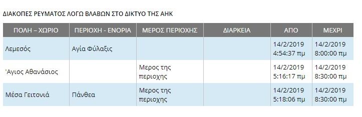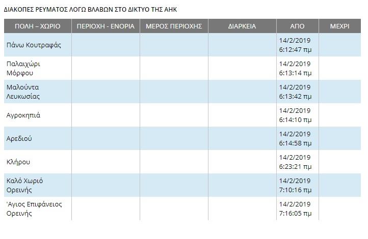 Συγκεκριμένα στη Λευκωσία χωρίς ρεύμα είναι οι περιοχές Πάνω Κουτραφάς, Παλαιχώρι, Μαλούντα,Αγροκηπιά, Αρεδιού, Κλήρου, Καλό Χωριό Ορεινής και Άγιος Επιφάνειος.