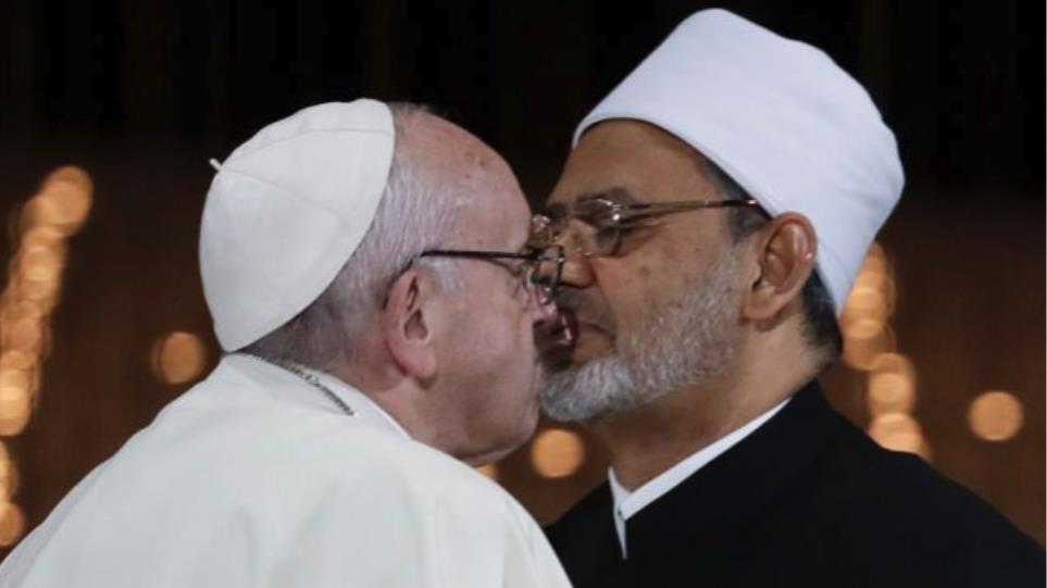 Δίνοντας με αυτό το περίεργο φιλί ένα μήνυμα αγάπης, ο Πάπας Φραγκίσκος και ο Αλ Αζχαρ καταδίκασαν κάθε διάκριση εις βάρος των θρησκευτικών μειονοτήτων ζητώντας να υπάρξει αδελφοσύνη σε ένα κείμενο που υπέγραψαν τη Δευτέρα το απόγευμα