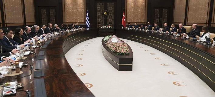 Στην εικόνα εμφανίζονται αξιωματούχοι των δυο χωρών, παρουσία των Αλέξη Τσίπρα και Ταγίπ Ερντογάν, να παρακάθονται σε αίθουσα συνεδριάσεων.