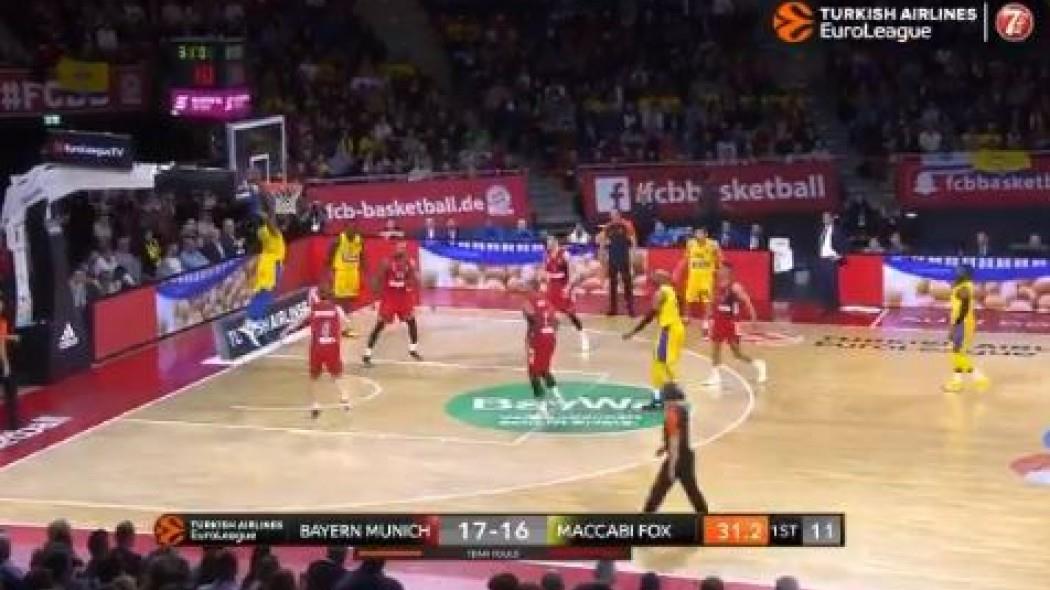 Ο Αμερικανός φόργουορντ της Μακάμπι Τελ Αβίβ κινήθηκε στην «πλάτη» της άμυνας της Μπάγερν Μονάχου και κάρφωσε εντυπωσιακά, αξιοποιώντας την όμορφη ασίστ του Τζέρεμι Πάργκο.