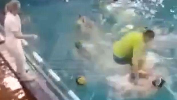 Ο προπονητής της μιας εκ των δύο ομάδων έπεσε στην πισίνα για να δείρει αντίπαλο! Μάλιστα, το έκανε εντυπωσιακά πηδώντας πάνω στο θύμα του και όπως ήταν φυσιολογικό ακολούθησε χαμός με όλους τους παίκτες να εμπλέκονται στον καυγά.