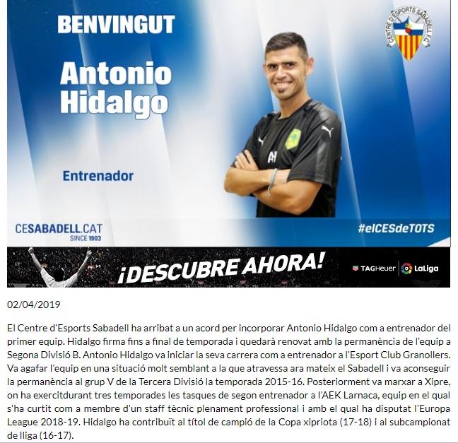 Λίγες ώρες μετά την γνωστοποίηση του διαζυγίου με την ΑΕΚ, ο πρώην βοηθός της ομάδας της Λάρνακας, Αντόνιο Ιντάλκο ανακοινώθηκε από την Σαμπατέλ, ομάδα β’ κατηγορίας στην Ισπανία.
