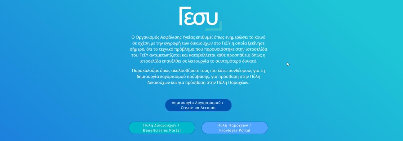 Οι πολίτες λόγω του τεχνικού προβλήματος που παρουσιάστηκε στην ιστοσελίδα του ΓΕΣΥ μπορούν να χρησιμοποιήσουν εναλλακτικά και μέχρι την αποκατάσταση του, μέσω του ακόλουθου συνδέσμου: https://portal.gesy.org.cy.