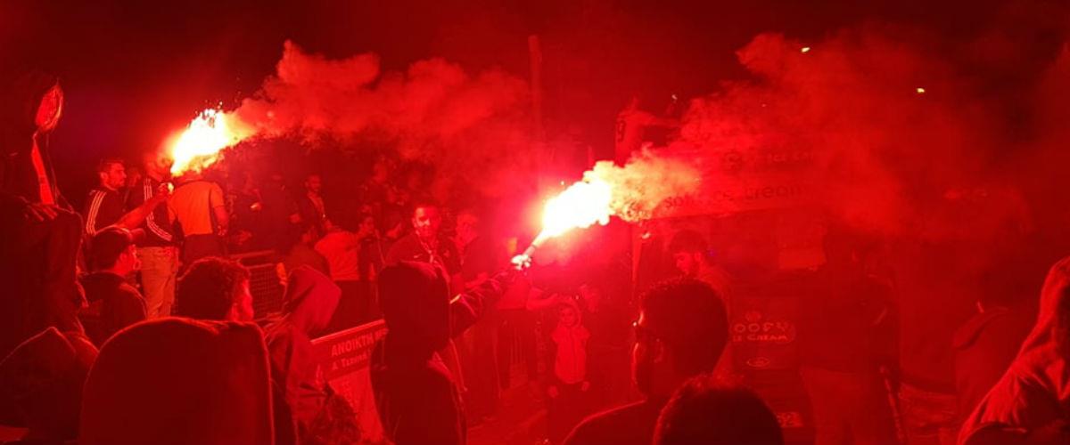 Οι παίκτες ενώθηκαν με τον κόσμο της ομάδας και με συνθήματα και φωτοβολίδες έκαναν τη νύχτα μέρα.
