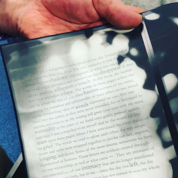 Ανάμεσα στις σελίδες του, κρύβονται ερωτικές επιστολές σε πεζογραφημένη ποίηση,  που δεν τις έλαβε κανείς, ποτέ. Το κείμενο αντλεί παραλληλισμούς μεταξύ των έντονων ερωτικών παραληρηματικών που διαδραματίζονται στην ανταλλαγή τέτοιων επιστολών, με βάση τις ανθρώπινες σχέσεις, και τη βαρυσήμαντη σχέση μεταξύ της αφής, του έρωτα, της αγάπης, της θλίψης, της απογοήτευσης, του πένθους, και της απώλειας. Η αλληλεπίδραση του αναγνώστη κάνει τις έντονες σκέψεις που κρύβονται στις σκοτεινές σελίδες του βιβλίου να αναδυθούν στην επιφάνεια.