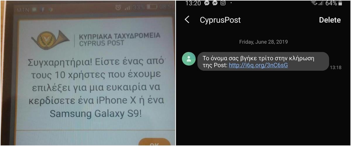 Η Αστυνομία Κύπρου (Γραφείο Καταπολέμησης Ηλεκτρονικού Εγκλήματος) δέχτηκε το τελευταίο διάστημα καταγγελίες από πολίτες, ότι δέχθηκαν αριθμό μηνυμάτων τύπου SMS αλλά και μέσω Facebook ή και γενικότερα στο διαδίκτυο, ότι τα Κυπριακά Ταχυδρομεία επιλέγουν διάφορους συνδρομητές που τους δίνουν τη δυνατότητα να κερδίσουν διάφορα δώρα, όπως κινητά τηλέφωνα.