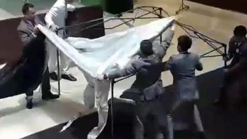 Φωτογραφίες από τους παρευρισκόμενους δείχνουν πώς οι φύλακες κάλυψαν το σώμα του με μια σκηνή πριν ελέγξουν την κατάσταση του.