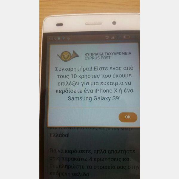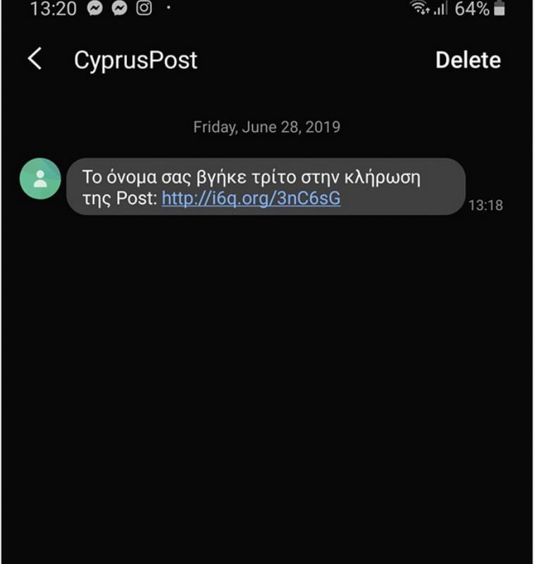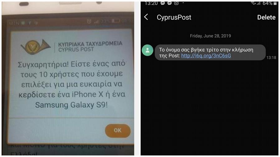 Η Αστυνομία Κύπρου (Γραφείο Καταπολέμησης Ηλεκτρονικού Εγκλήματος) δέχτηκε το τελευταίο διάστημα καταγγελίες από πολίτες, ότι δέχθηκαν αριθμό μηνυμάτων τύπου SMS αλλά και μέσω Facebook ή και γενικότερα στο διαδίκτυο, ότι τα Κυπριακά Ταχυδρομεία επιλέγουν διάφορους συνδρομητές που τους δίνουν τη δυνατότητα να κερδίσουν διάφορα δώρα, όπως κινητά τηλέφωνα.