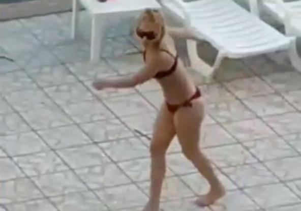 Φορούσε το μικροσκοπικό μαγιό της και έπιανε τις καρέκλες ηλιοθεραπείας και τις εκσφενδόνιζε στην πισίνα. Και όσο γινόταν αυτό και η τουρίστρια δεν σταματούσε, τόσο οι άλλοι από τα μπαλκόνια τους την ενθάρρυναν να συνεχίσει να πετάει τις ξαπλώστρες στο νερό.
