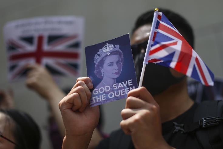 Εκατοντάδες άνθρωποι έψαλNαν τον βρετανικό ύμνο και κρατούσαν τη σημαία του Ηνωμένου Βασιλείου, την Union Jack, καθώς και τη σημαία της πρώην αποικίας του Χονγκ Κονγκ.