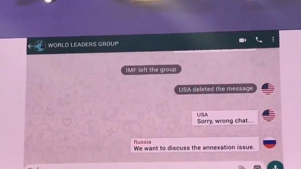 Στο ξεκίνημα της φανταστικής συνομιλίας στο WhatsApp, με τίτλο «Ομάδα Παγκόσμιων Ηγετών», o Ζελένσκι συστήνεται στους ομολόγους του, οι οποίοι με τη σειρά τους τον χαιρετούν στη γλώσσα τους. Η Βρετανία στέλνει ένα... ακατανόητο μήνυμα, προκαλώντας την απορία των άλλων Ευρωπαίων ηγετών (Ίσως μια σπόντα για την αλλοπρόσαλλη στάση της στο Brexit;).