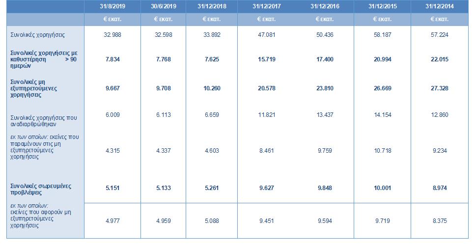 Κολλημένα στα €9,7 δις παρέμειναν οι συνολικές μη εξυπηρετούμενες χορηγήσεις τον Αύγουστο του 2019 σύμφωνα με τα στατιστικά στοιχεία της Κεντρικής Τράπεζας, ενώ ελαφρώς αυξημένες παρουσιάζονται οι χορηγήσεις με καθυστέρηση πέραν των 90 ημερών οι οποίες διαμορφώθηκαν στα €7.834 εκατ. τον περασμένο Αύγουστο σε σχέση με €7.768 εκατ. που ήταν τον Ιούνιο. Παράλληλα, το σύνολο των χορηγήσεων παρουσιάζεται μειωμένο τον Αύγουστο σε σχέση με τον Δεκέμβριο του 2018, καθώς οι συνολικές χορηγήσεις προς επιχειρήσεις και νοικοκυριά μειώθηκε στα €32.988 εκατ. τον Αύγουστο σε σχέση με €33.892 εκατ. που ήταν τον Δεκέμβριο του 2018.