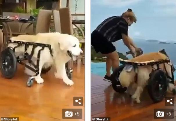 Όμως για ένα γκόλντεν ριτρίβερ, το νερό είναι μια διασκέδαση που πάντα το ελκύει. Όταν ο Λάϊον είδε την πισίνα γεμάτη, ασταμάτητος έτρεξε με το καροτσάκι, πήρε παραμάζωμα μια καρέκλα και βούτηξε όλο χαρά μέσα στο νερό.