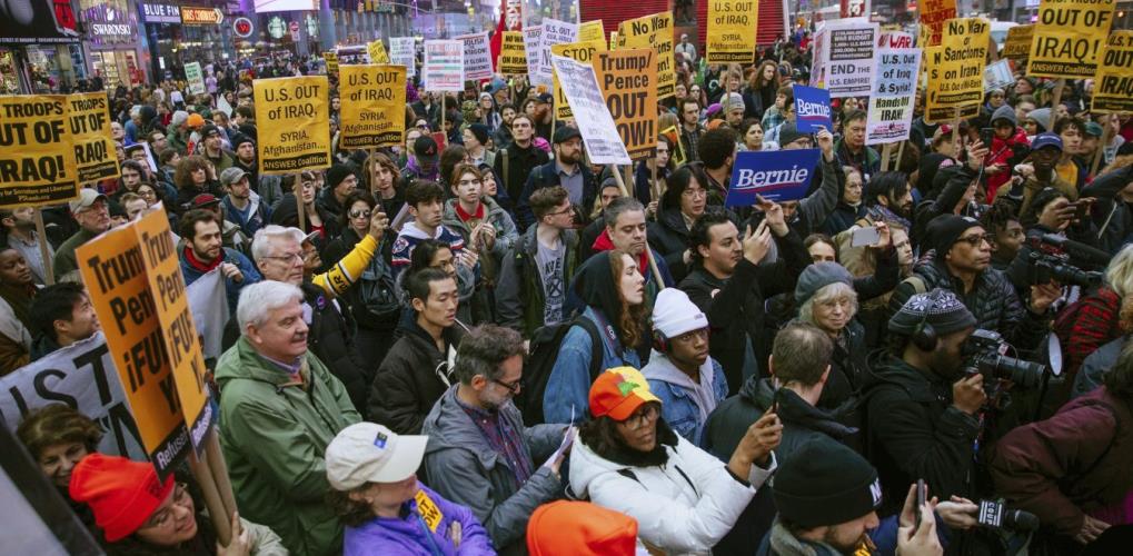 Φωνάζοντας συνθήματα όπως «όχι πόλεμος με το Ιράν» και «έξω οι ΗΠΑ από τη Μέση Ανατολή», πολλοί διαδηλωτές συγκεντρώθηκαν σήμερα στην Ουάσινγκτον, στη Νέα Υόρκη και σε άλλες πόλεις για να εκφράσουν την αντίθεσή του με την κλιμάκωση της έντασης μετά τον θάνατο του πανίσχυρου Ιρανού στρατηγού Κασέμ Σουλεϊμανί.