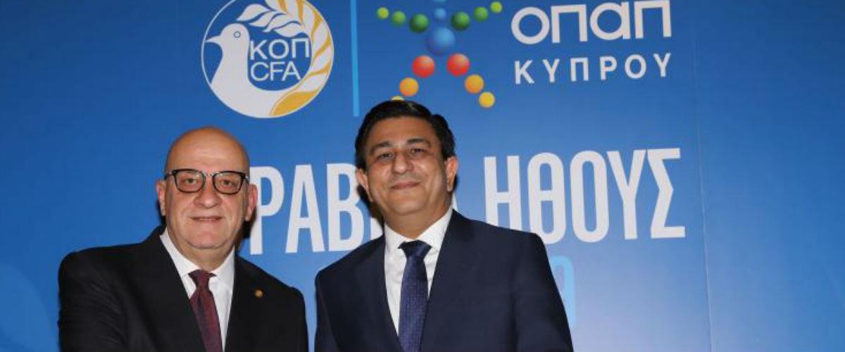 Ο Πρόεδρος της ΚΟΠ Γιώργος Κούμας και ο Διευθύνων Σύμβουλος της ΟΠΑΠ Κύπρου Δημήτρης Αλετράρης, ανακοίνωσαν την επέκταση της συμφωνίας της ΚΟΠ με την ΟΠΑΠ για τη χορηγία της Εθνικής μας ομάδας των Ανδρών.