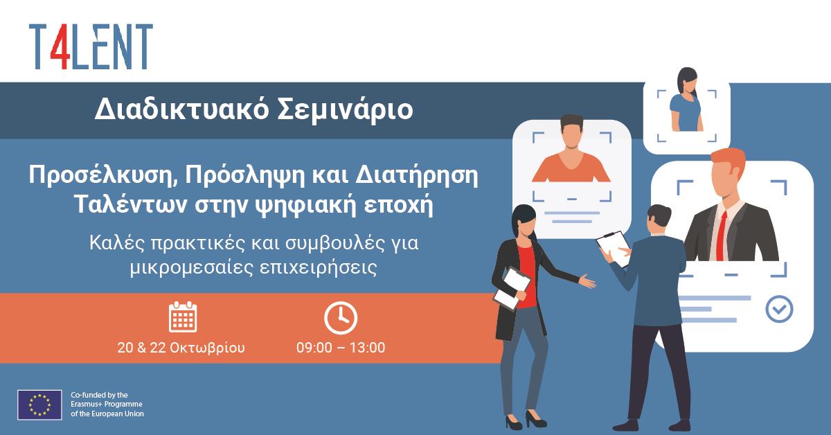 Το ερευνητικό κέντρο CARDET διοργανώνει την Τρίτη 20 και Πέμπτη 22 Οκτωβρίου (09:00 μέχρι τις 13:00), ένα δωρεάν διαδικτυακό σεμινάριο για την παρουσίαση των δεδομένων και ευκαιριών που διαμορφώνονται όσον αφορά την Πρoσέλκυση, Πρόσληψη και Διατήρηση ταλαντούχου προσωπικού στην ψηφιακή εποχή. Επιδίωξη του διήμερου σεμιναρίου είναι να ενισχύσει την ικανότητα στελεχών ανθρωπίνου δυναμικού αλλά και των μικρομεσαίων επιχειρήσεων να εκμεταλλευτούν τις ευκαιρίες και τα εργαλεία που διαμορφώνονται μέσω της ανάπτυξης της ψηφιακής τεχνολογίας.