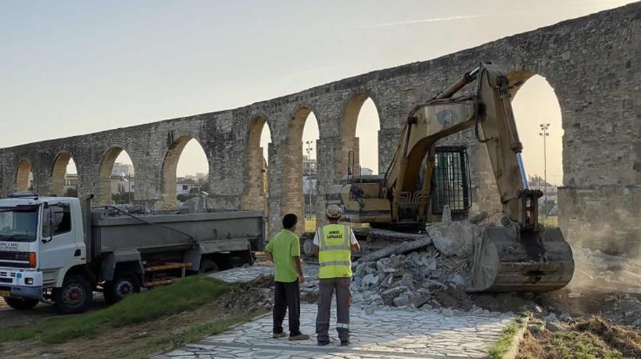 Άρχισε σήμερα η κατεδάφιση της ανατολικής εξέδρας που βρίσκεται στη πρόσοψη του μνημείου των Καμάρων, με στόχο την κατασκευή αντιπλημμυρικών έργων στα πλαίσια προστασίας οικιστικών ζωνών των Δήμων Λάρνακας και Αραδίππου.