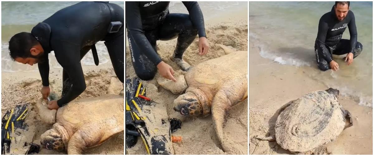 Το σύντομο βίντεο δείχνει τον ψαρά, ο οποίος έχει ακινητοποιήσει την μεγάλη σε μέγεθος χελώνα και κόβει τα δίκτυα που έχουν πιαστεί γύρω από το λαιμό της, αλλά και από τα πόδια της.