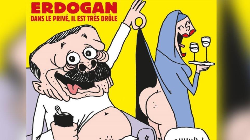 Το νέο εξώφυλλο του γαλλικού σατιρικού περιοδικού Charlie Hebdo έριξε λάδι στη φωτιά. Έχει σκίτσο που δείχνει τον πρόεδρο Ερντογάν με τα εσώρουχα, να σηκώνει το χιτζάπ μιας μουσουλμάνας, παρατηρώντας τα γυμνά οπίσθια της και να αναφωνεί «Ω! Ο Προφήτης!».
