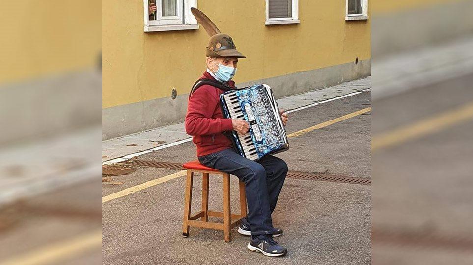Ο 81χρονος έχει πάρει μία καρέκλα και κάθεται στον άδειο δρόμο, παίζοντας το ακορντεόν του για την 47χρονη σύζυγό του Carla Sacchi, η οποία τον παρακολουθεί από το παράθυρο του δωματίου της.