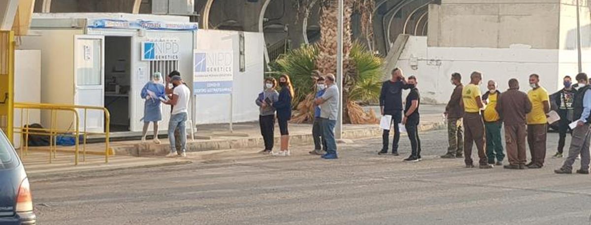 Εργαζόμενοι που μετακινούνται από την Πάφο για άλλες επαρχίες συγκεντρώθηκαν στο Χώρο Στάθμευσης του Σταδίου « Στέλιος Κυριακίδης « για την μοριακή εξέταση (PCR test) μετά την ανακοίνωση του Υπουργείου Υγείας για ενίσχυση και την προσθήκη νέων σημείων δειγματοληψιών στις δύο Επαρχίες.
