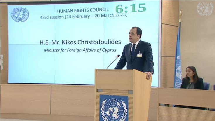 Ο κ. Χριστοδουλίδης, ο οποίος μιλούσε στο Τμήμα Υψηλού Επιπέδου της 43ης συνόδου του Συμβουλίου Ανθρωπίνων Δικαιωμάτων των Ηνωμένων Εθνών, στη Γενεύη αναφέρθηκε και στις παραβιάσεις των ανθρωπίνων δικαιωμάτων στην Κύπρο μετά την τουρκική εισβολή του 1974, οι οποίες εξακολουθούν να υφίστανται σήμερα.