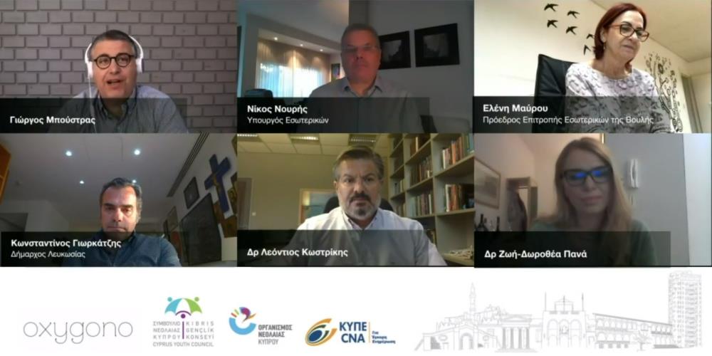 Ο υπουργός Εσωτερικών, Νίκος Νουρής, η πρόεδρος της Επιτροπής Εσωτερικών της Βουλής Ελένη Μαύρου, ο Δήμαρχος Λευκωσίας, Κωνσταντίνος Γιωρκάτζης, ο Καθηγητής Βιολογικών Επιστημών και σύμβουλος του Υπουργείου Υγείας Δρ. Λεόντιος Κωστρίκης, και η Ειδική Παιδίατρος και σύμβουλος του Υπουργείου Υγείας Δρ. Ζωή-Δωροθέα Πανά, σε μια διαδικτυακή συζήτηση με συντονιστή τον Καθηγητή Εκτίμησης Κινδύνου στο Ευρωπαϊκό Πανεπιστήμιο Κύπρου και Διευθυντή του Κέντρου Κινδύνων και Επιστημών Αποφάσεων (CERIDES), Δρ. Γιώργο Μπούστρα, συζήτησαν για τη ζωή στην πόλη μετά την εκδήλωση της πανδημίας.